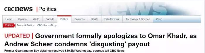 目前,加拿大一部分人在网上发起了抗议请愿活动,要求Omar把自己获得的赔偿金交出来送给被炸死的军医和受伤士兵的家属。这事儿最近真的快把加拿大吵翻了。。