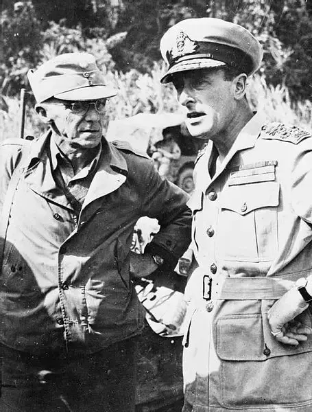 1944年,时任盟军东南亚战区总司令的蒙巴顿与副司令约瑟夫·史迪威(左)交谈