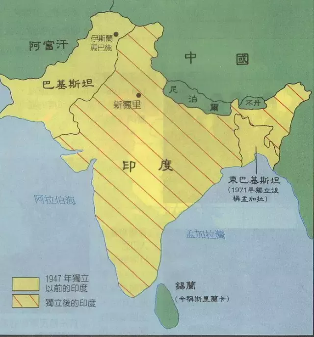 47年,蒙巴顿提出了著名的《蒙巴顿方案》,提出了“分而治之”原则,为了避免印度国内印度教与伊斯兰教的宗教矛盾,把印度的国土就分成三个部分:印度、东巴基斯坦和西巴基斯坦。