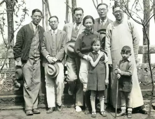 1938年,(左起)周培源、梁思成、陈岱岳、林徽因、金岳霖、吴有训、梁再冰及梁从诫(两小孩)在昆明西山华亭寺