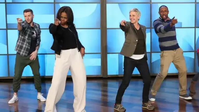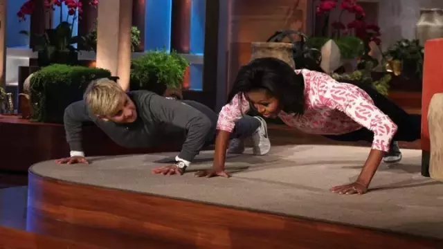 而米歇尔也不止一次做客Ellen Show,在节目里这位曾经的第一夫人被Ellen“忽悠”一起比赛做俯卧撑、一起热舞。俩人还曾经一起逛超市,幽默调皮的Ellen不仅在一旁用挠痒痒的“老头乐”干扰米歇尔购物,最后所幸跳进了米歇尔的购物车“搭顺风车”。
