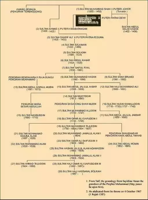《文莱王室世系图》(图中选中部分:ONG SUM PING 即开辟文莱王国的华人黄森屏)