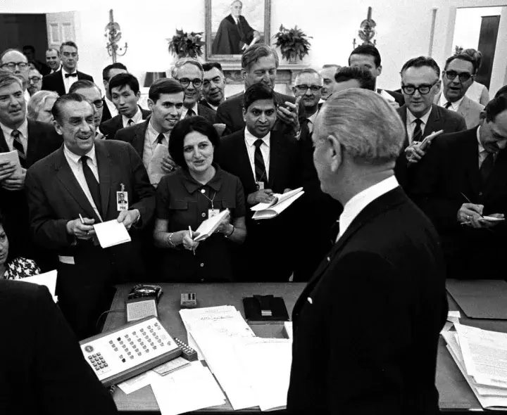 1968年,海伦在白宫椭圆形办公室向约翰逊提问