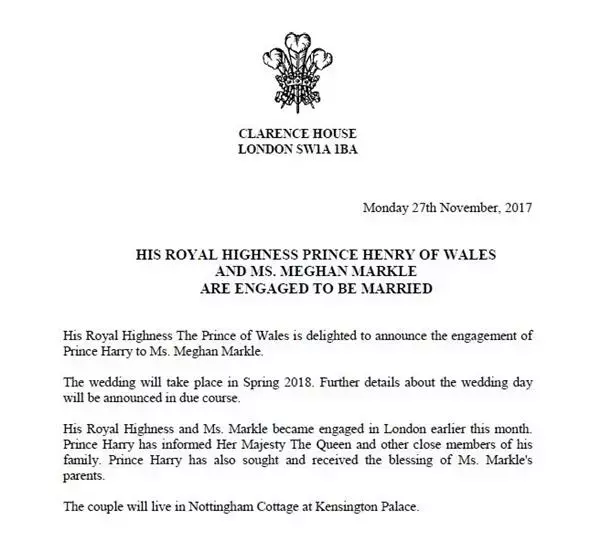 11月27日,英国白金汉宫发出一纸告示,宣布33岁的哈里王子已经在本月初和36岁的美国女演员梅根订婚