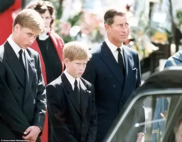 哈里王子(中)和哥哥还有父亲查尔斯在母亲戴安娜的葬礼上