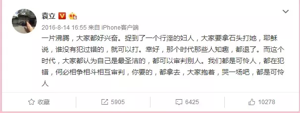 偏偏信奉基督教的袁立不按常理出牌,在微博上说了一句公道话:“一片沸腾,大家都好兴奋。捉到了一个行淫的妇人,大家要拿石头打她,耶稣说,谁没有犯过错的,就可以打。”