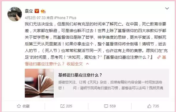 2017年4月2日,袁立一段关于清明节的直抒胸臆又让网友怒骂不止,除了一些词不达意的错别字,网友怒批其“崇洋媚外”。