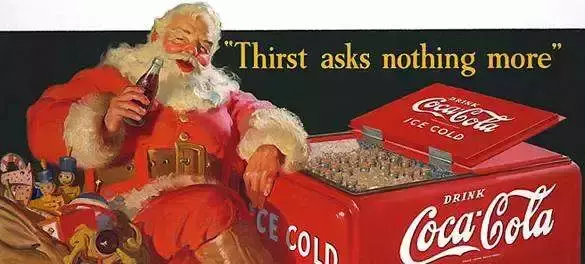 1931年,可口可乐公司聘请了著名画家Sundblom画出了圣诞老人的广告图,在画中,留着一把雪白大胡子的圣诞老人穿着象征可口可乐公司logo的红衣服,在偷喝可乐。