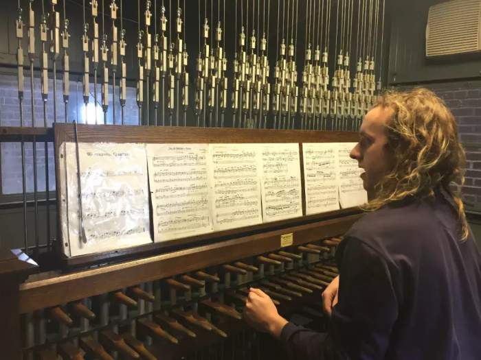 我们从窄窄的旋转的楼梯攀爬而上,最后来到顶楼。这里面积很小,中间放着一架古老的管风琴,周围也仅能容下5、6人而已。管风琴的琴键是一根根圆形木棍,因此弹琴时不是用手指压在琴键上,而是用手握成拳头砸在琴键上,而脚也要用力踩在脚踏板上。这位学生先在管风琴上演奏了叮当作响的报时钟声后,就开始演奏起优美的乐曲来。他接二连三地演奏各种曲目,手脚并用,忘情地演奏,陶醉其中,54口钟琴把悠扬的音乐送到校园的四面八方,也把我带入一个美妙的音乐世界。