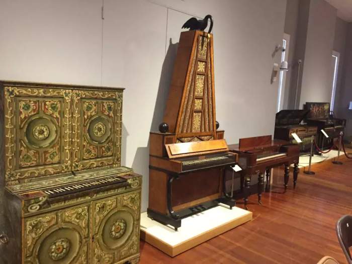 耶鲁大学乐器博物馆展出的部分古老的钢琴。大多数都是校友捐赠的 江亚平 摄