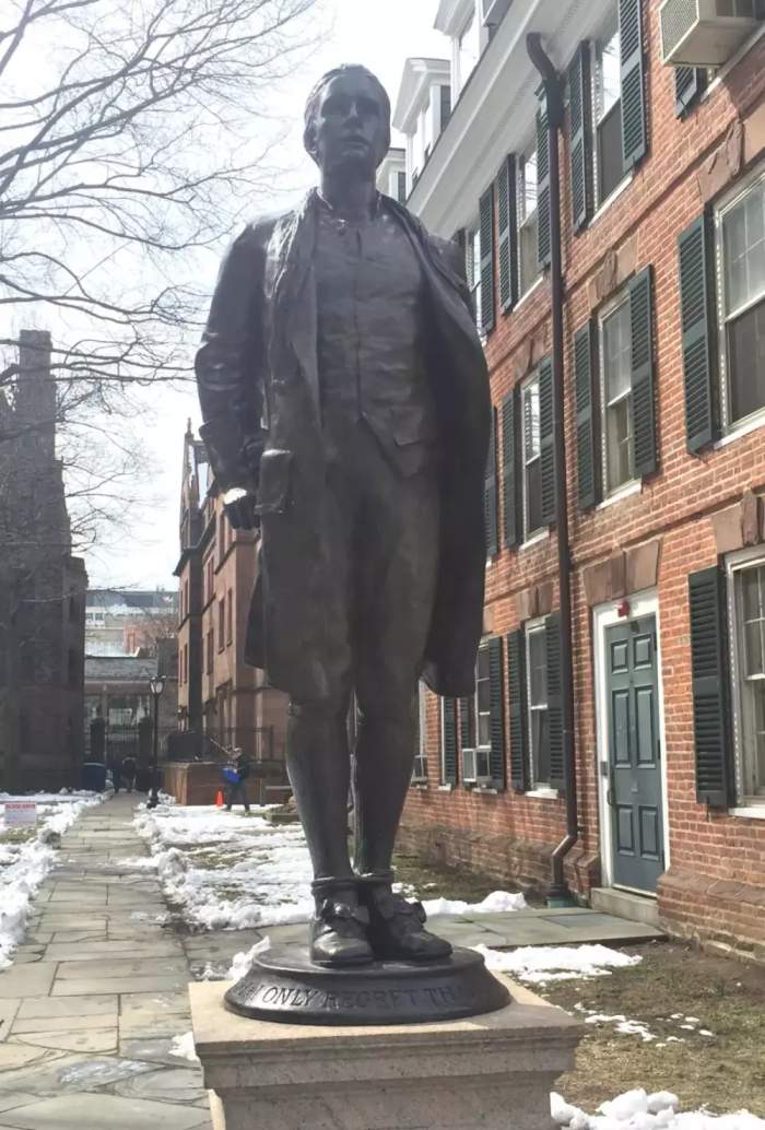 关于黑尔,我年轻时就从英文课本中熟知了他的事迹。在他曾经住过的校舍旁,耶鲁为他塑了一尊全身铜像。这是个英俊的年轻人,脸庞瘦削,英气逼人。不过一夫指着铜像告诉我,这并非黑尔的“本来面目”。原来,他去世的时候并没有留下照片和遗像,因此学校无从知道他的模样。后来要建造一尊铜像纪念他,于是学校就召集当时所有的在校男生到草坪上,从中挑出一位最为英俊潇洒的学生,把他作为黑尔雕塑的蓝本,这才有了现在我们看到的雕塑。在所有的耶鲁人看来,黑尔本身就是最完美最英俊的耶鲁人。