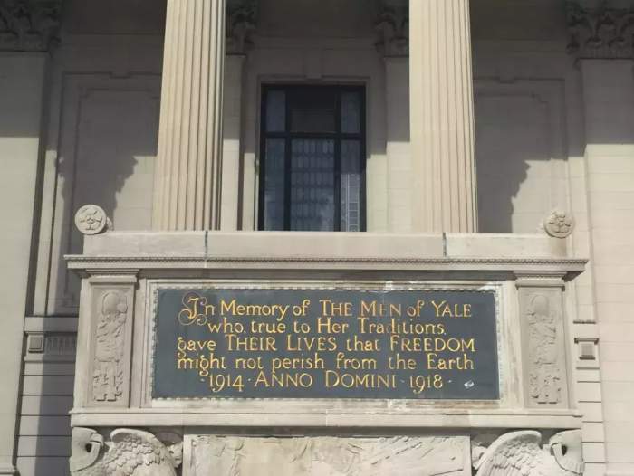 我停留在一块白色大理石纪念碑前,心情久久不能平静。这块碑是为纪念在第一次世界大战中死去的耶鲁校友而竖立的。一战于1914年爆发,当时远在北美大陆的美国并没有参战,而是静观其变,直到1917年的关键时候,美国才宣布正式参战。在这场战争中,耶鲁学生积极响应号召,义无反顾地投笔从戎,到欧洲最残酷的战场上去,许多人因此为国捐躯,马革裹尸。据记载,在1917年到1918年大战结束的大约1年多时间里,有9500名耶鲁人参战,其中227人牺牲。