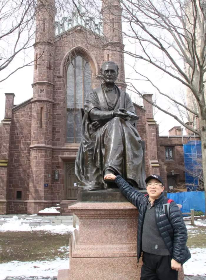 本文作者在耶鲁大学校长西奥多·德怀特·伍尔西雕像前留影 董一夫 摄