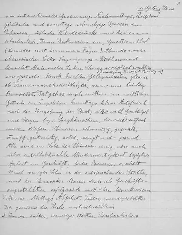 首先,爱因斯坦对中国人的一些生活习惯并不理解:“中国人吃饭时不坐在凳子上,而是蹲着吃——就像欧洲人在丛林里解手时一样——所有这一切都发生得悄无声息且一本正经。”