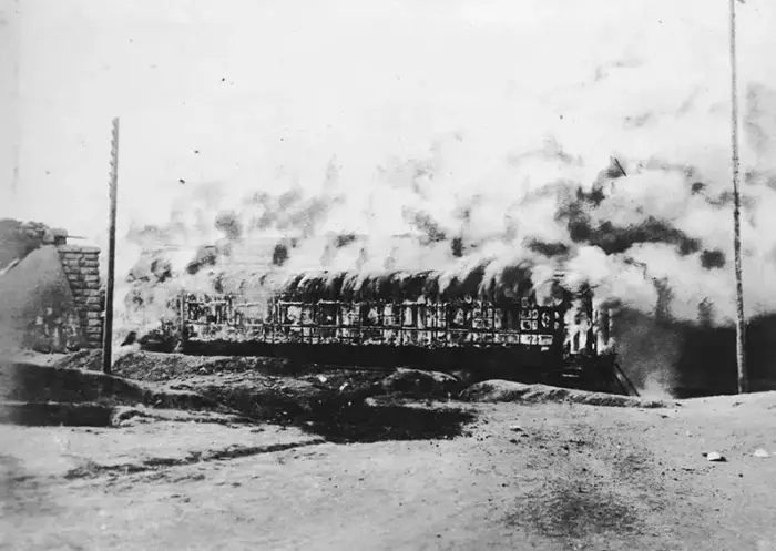张作霖被刺现场,三洞桥上的铁路已被炸塌,其专列燃起熊熊大火。供图:徐家宁