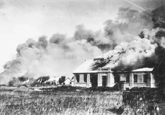 1931年9月19日,昌图的红顶山兵营在被日军空袭后燃起大火。