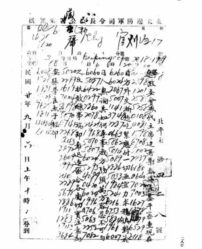 1931年9月6日张学良向荣臻发出的不抵抗“鱼电”(“鱼”代六日)