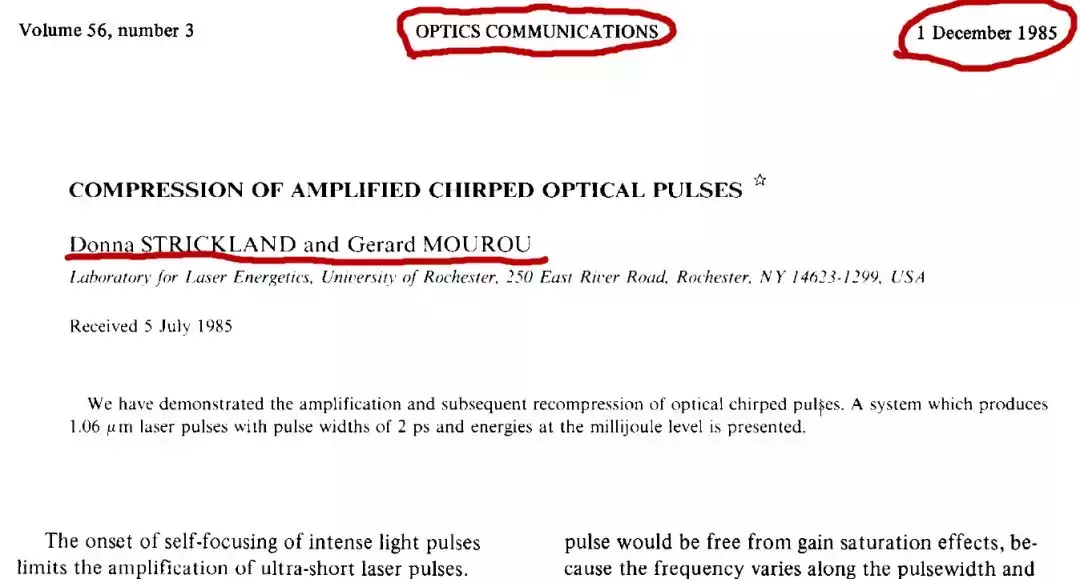 实验很简单,做完后老师也没意识到有多重要,就把论文发在《光学通信》上。那年斯特里克兰年方26,还只是一个博士生。谁也不会想到,就是这篇文章,让师生2人若干年后获得了诺奖。当然,最想不到的,恐怕是那位提出问题后,就回家了的聪明学生吧?
