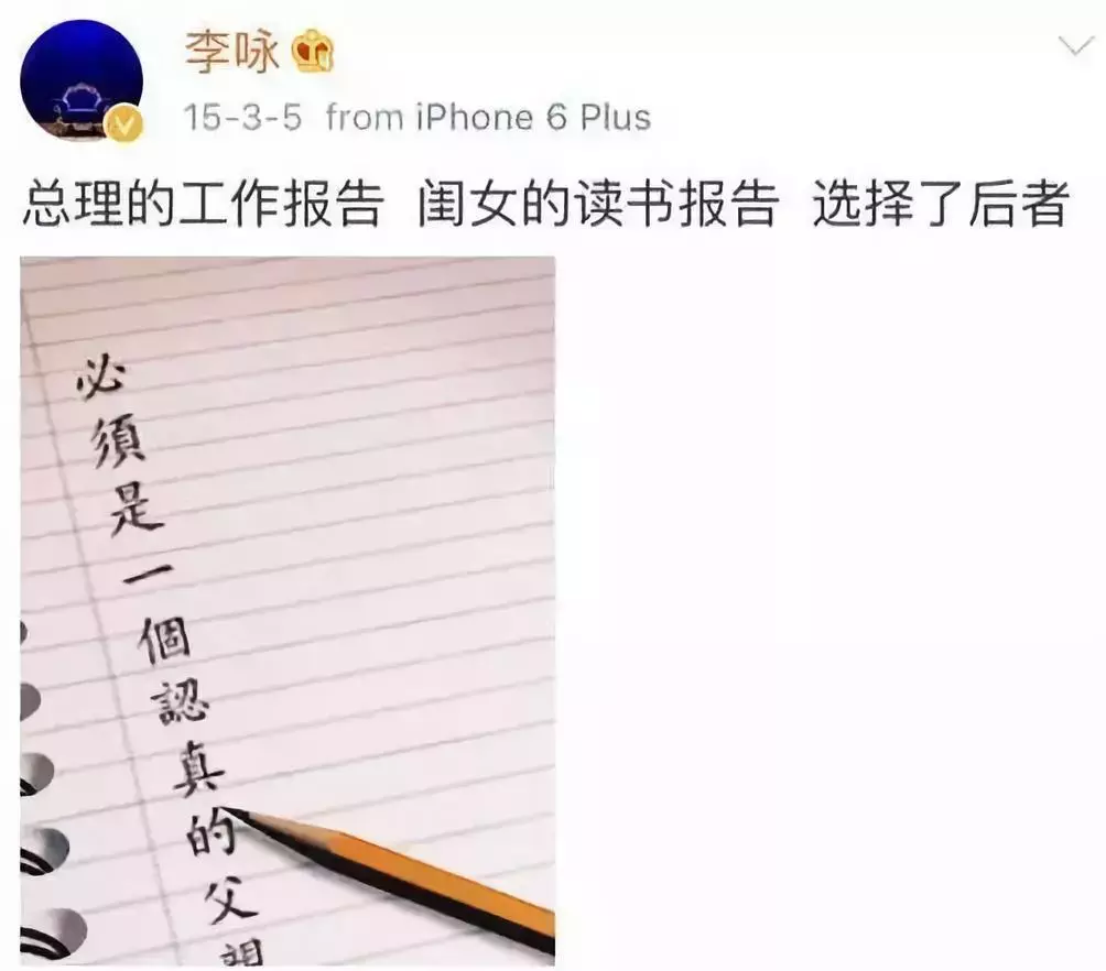 生活中,李咏永远是最宠爱女儿的人,在总理的报告和女儿的报告中,他毫不犹豫地选择了后者。