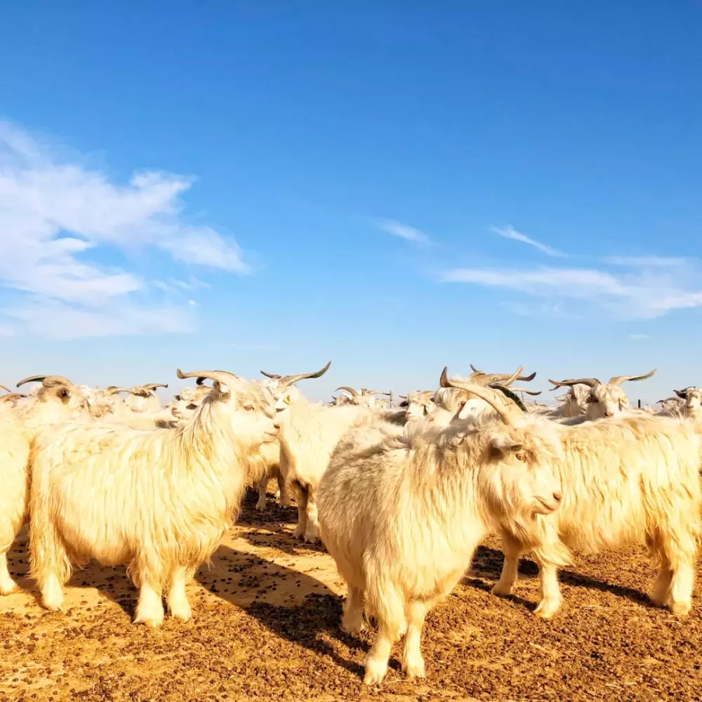 郭秀玲只选择那些纯种的阿拉善公羊和母山羊配种, 并在羊羔出生后甄选出毛质最出色的小羊加以分别圈养,维护了羊绒在源头上的奢华本质, 成为了Sand River品牌得天独厚的资源。