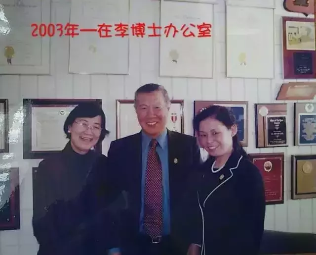 蒋霞萍(右一)第一次在美国李博士(中)办公室见到李博士夫人宋妙娟(左一)