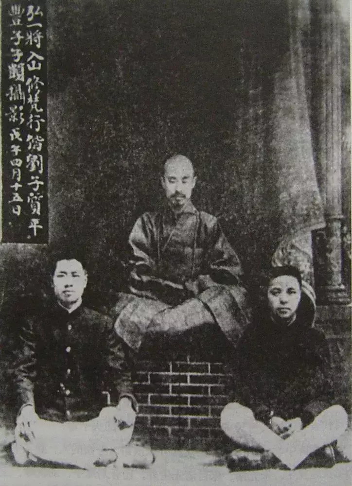 图:一九一八年,弘一法师入山修行,与弟子丰子恺(右)、刘质平合影