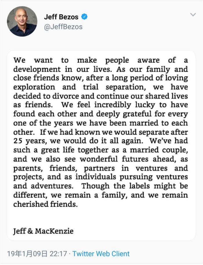 当地时间1月9日,杰夫·贝佐斯和妻子在推特上共同发表声明,他们已经决定离婚: