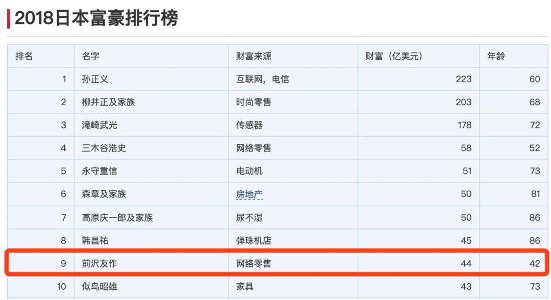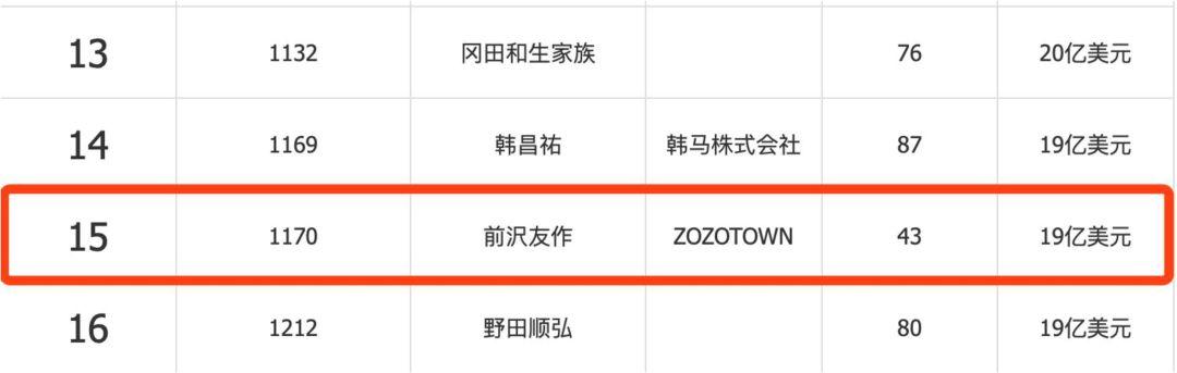 2019福布斯日本富豪榜中,年仅43岁的前泽友作,以19亿美元的身价排名第15。