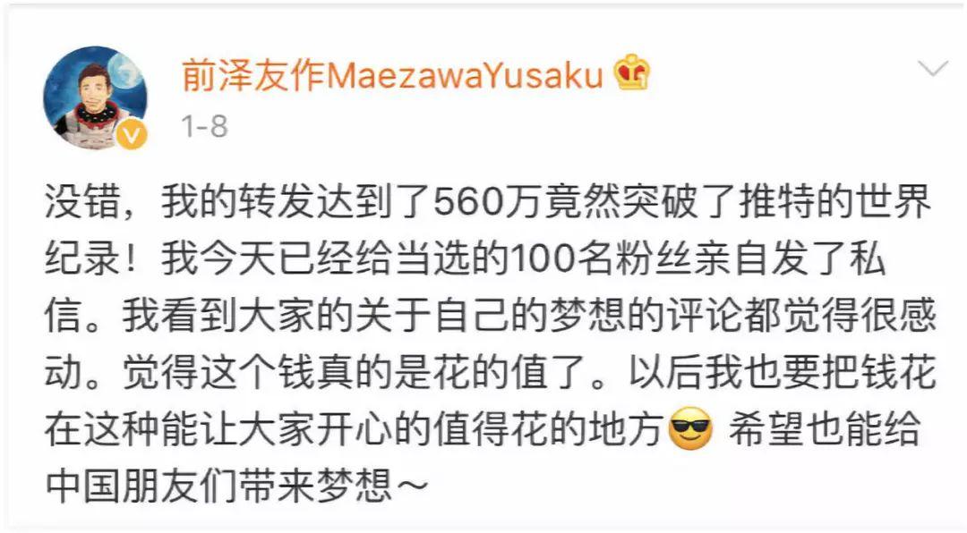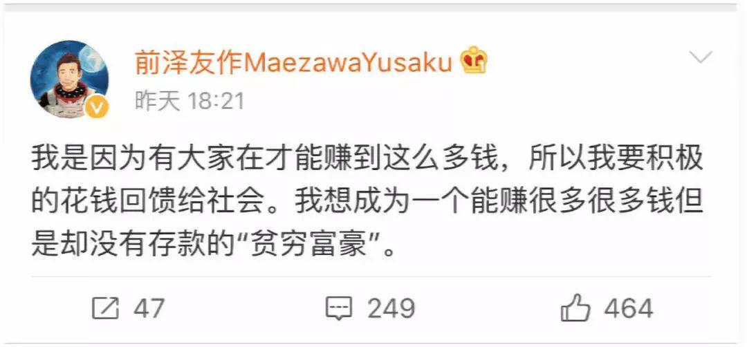 前泽友作专门出来回应了,看到大家关于自己梦想的评论,觉得这钱花得值!