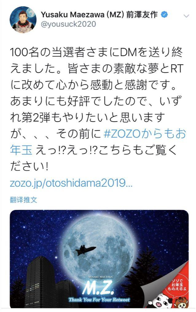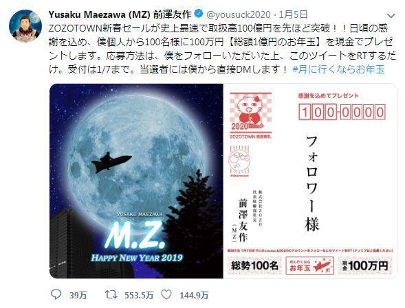 这不,这次前泽友作在推特上发起的抽奖,就是因为自家网站ZOZOTOWN新年销售额达到100亿日元!(约合人民币6亿元)