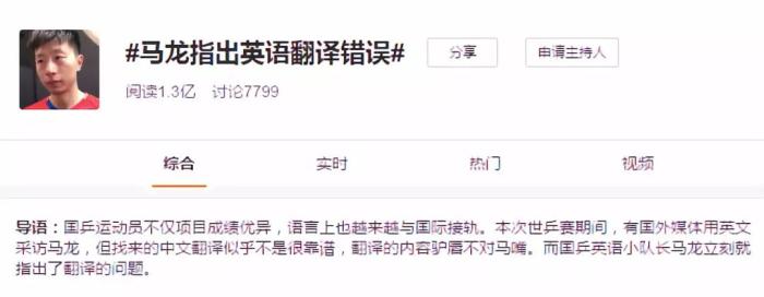 这其实不是龙队第一次因为英文上热搜了,在4月26日的1/4决赛赛后采访后,#马龙指出英语翻译错误#的话题就上了热搜。