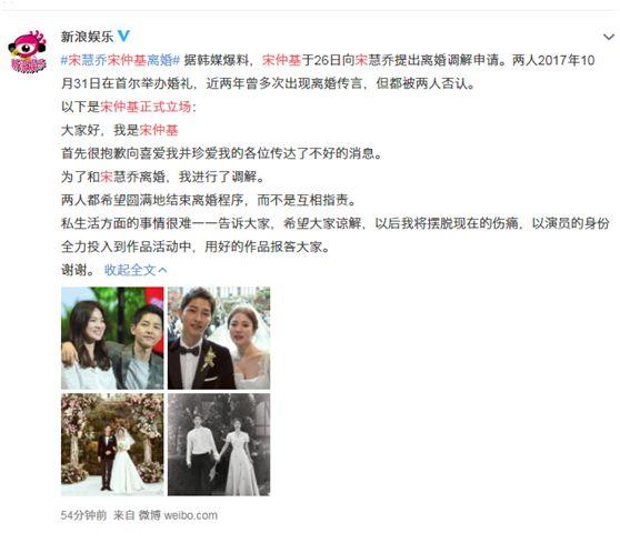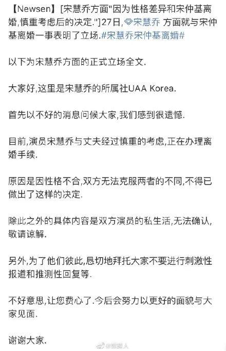 宋慧乔方面回应离婚消息 称“两人难以克服性格差异”
