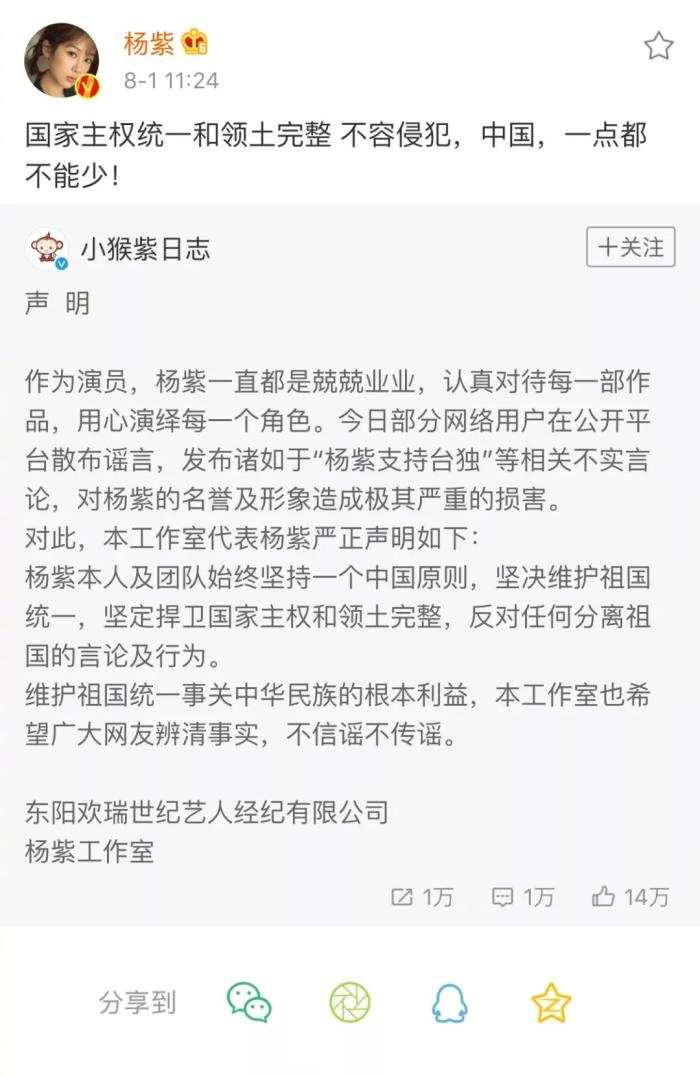 一时间,对杨紫“粉转黑”的人不计其数。尽管杨紫匆忙发微博表明立场,“国家主权统一和领土完整不容侵犯,中国,一点都不能少!”,也还是甩不掉“支持台独”的帽子。