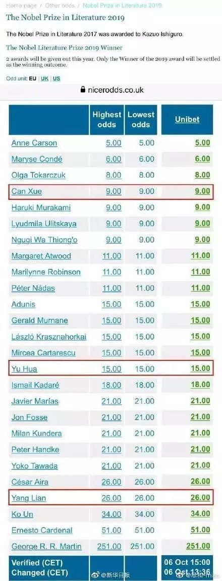 几天前,在英国博彩公司的预测榜上,残雪的赔率是第三名,热度超过日本的村上春树。