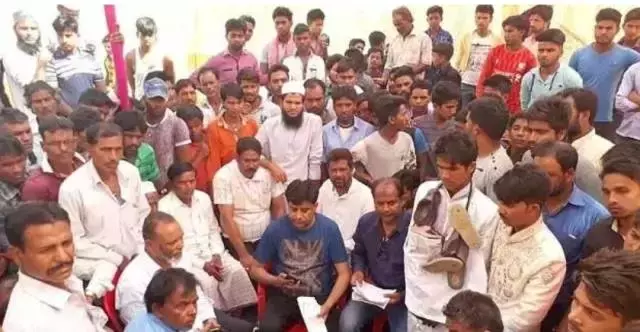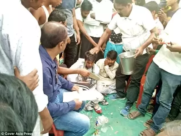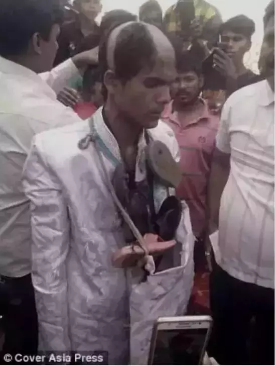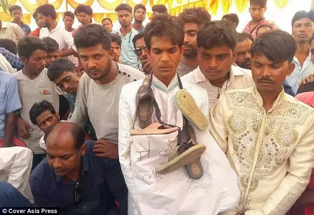 新郎Muntaj Ansari被大家推搡着挂上破鞋在示众!脖子上还挂了一个写了“我贪图嫁妆”的牌子!
