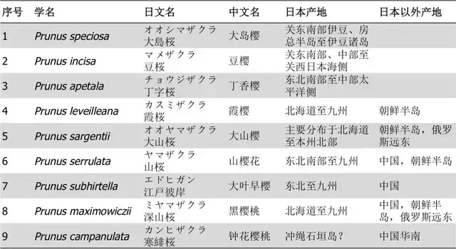 日本樱花的野生种(分类处理遵照美国农业部种质资源信息网)