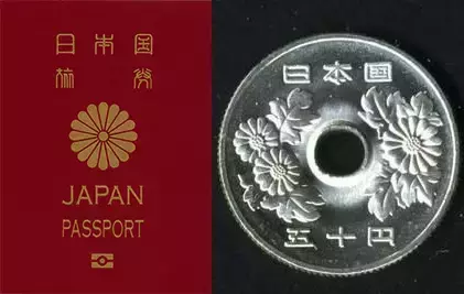 日本护照表页以菊纹为标记,日本大使馆门墙上以菊纹作装饰,50元日币背面也是一个菊花图案……