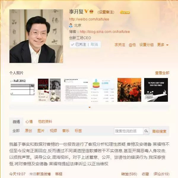 李开复在微博上表示,将起诉做空机构香橼及其创始人