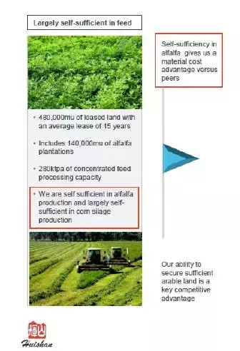 苜蓿被誉为“牧草之王”,是养奶牛必备的草料,也成为影响原奶销售价格的关键决定因素。辉山乳业声称苜蓿全部自给自足,不需要从第三方购买或安排长途运输,因此利润巨大。