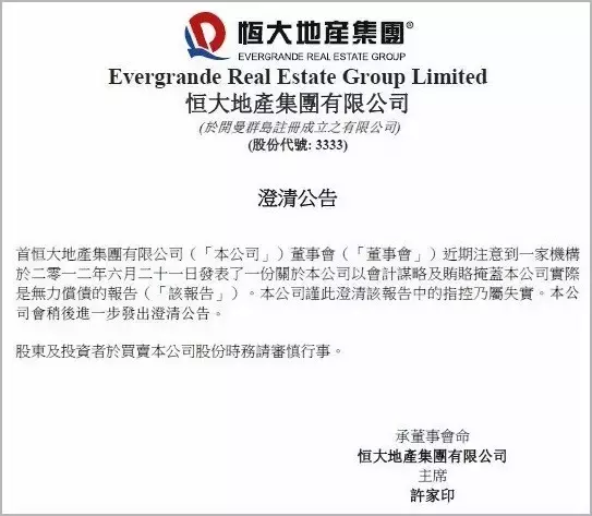 2012年6月20日,香橼投资一纸研报,恒大股价应声下挫,一日之间市值蒸发76.28亿港元。许家印将香橼投资称作“侵略者”、“土匪”、“强盗”。