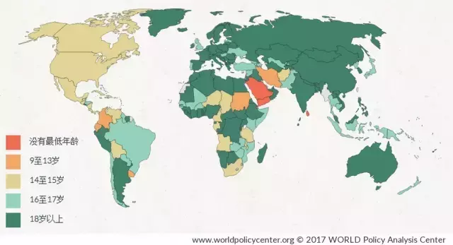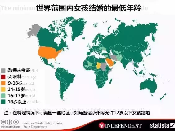 在世界范围内,美国对于结婚年龄的要求相对低,比如马萨诸塞州就允许12岁儿童“在特殊情况下”结婚。能与美国“并驾齐驱”的就只有沙特阿拉伯和也门,这两个国家里9~13岁的儿童被允许结婚。
