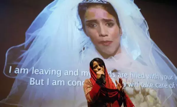Sonita在影片放映现场表演,她身后的大屏幕上是她的第一部mv《待售新娘》