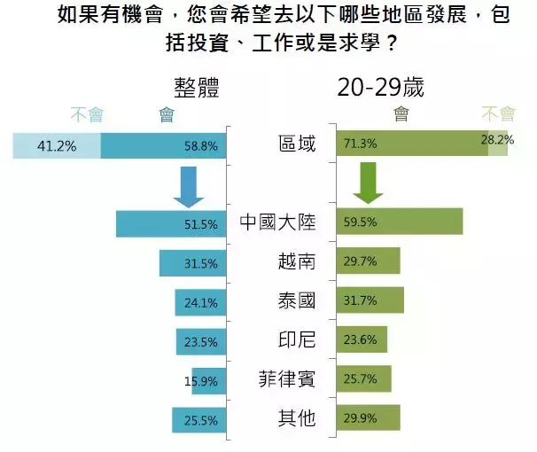 来自《远见研究调查》的数据显示,台湾年轻人(20~29岁)意愿往外发展,其中半数以上(59.5%)最想北上往大陆发展。