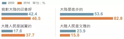 从2016年《联合报》的民调显示,台湾年轻人对大陆的整体正面印象比2000年提升,并高度肯定大陆是个进步的地方。