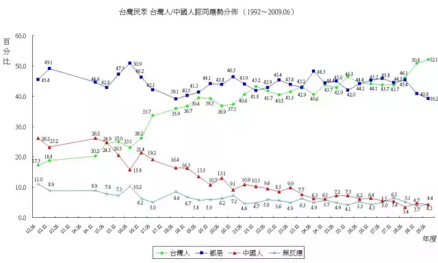 如图所示,台湾民众从1992年到2009年这17年间,自认为是“台湾人”的比例从17.3%上升到52.1%,自认为是“中国人”的比例从26.2%降到4.4%,自认为两者皆是的比例,从45.4%降到了39.2%。