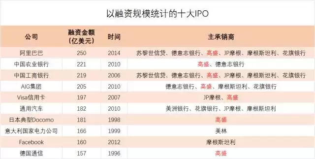 高盛是全球最大的上市承销商,在全球有史以来规模最大的十次上市行动中,高盛有七次担任主承销商。一般来讲,上市承销商可以获得融资金额7%左右的佣金和一些期权,高盛有多赚钱,可想而知。