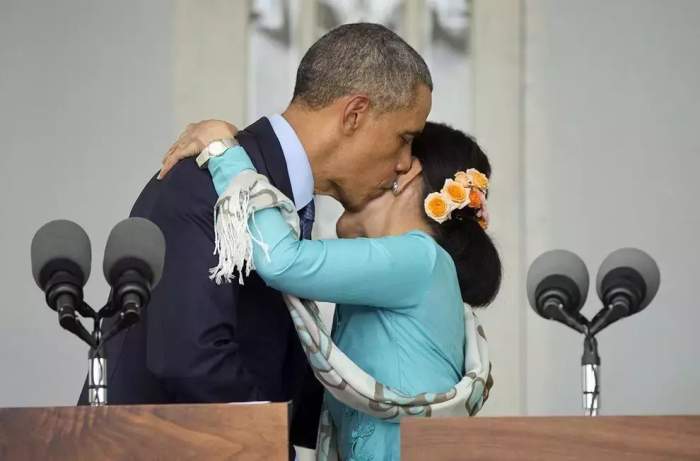 2014年11月14日,缅甸东盟峰会上,奥巴马与昂山素季举行会晤,并拥抱亲吻昂山素季。