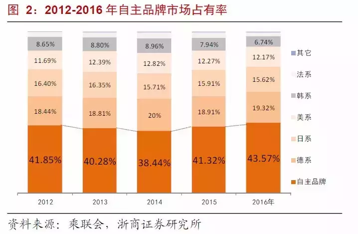 事实上,中国自主品牌汽车的市场占率有正在不断提升,已从2014年的38.44%快速上升至2016 年的43.57%。