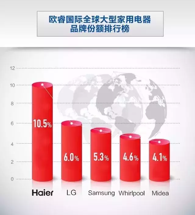 2017年,欧睿国际发布的全球大型家用电器品牌零售量数据显示,海尔高居第一,惠而浦已经掉到第四,市场占有率不到海尔的一半。