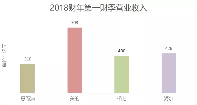 同期,美的、格力和海尔的营业总收入分别为703亿元、400亿元、426亿元,远高于惠而浦。
